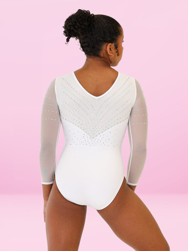 Radiate grace and strength in Halo, a ¾ sleeve leotard designed to captivate with simplicity and shine. Featuring a sleek white mystique body and delicate white mesh sleeves, this design is the epitome of clean sophistication.