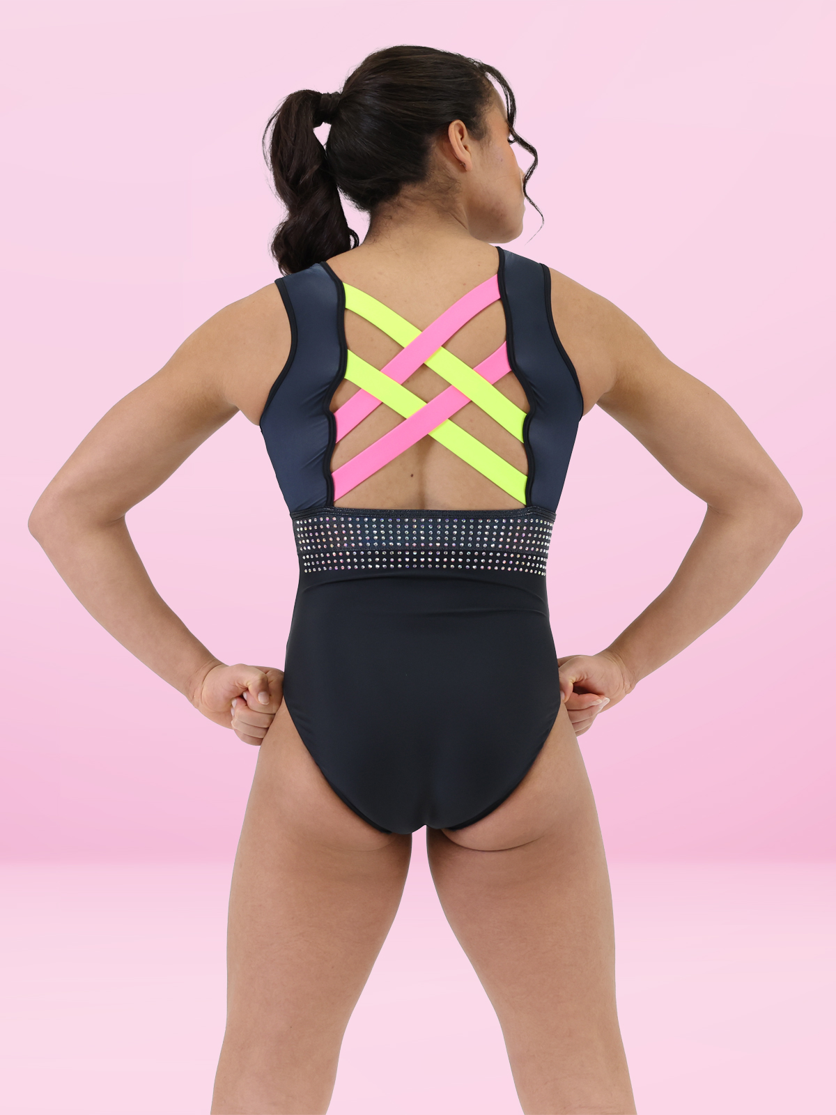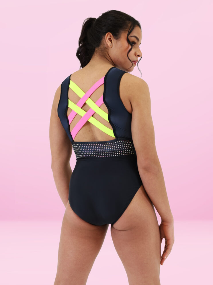 Sorbet reimagines the Peach design with a sleek, powerful edge. The black lycra lower bodice is paired with a black laser mystique waistband, creating a striking contrast against the vibrant pink-to-yellow diamond detailing.